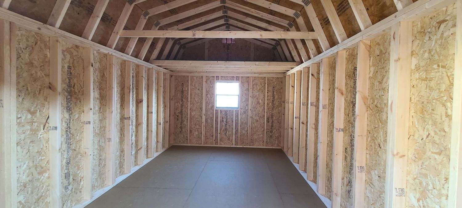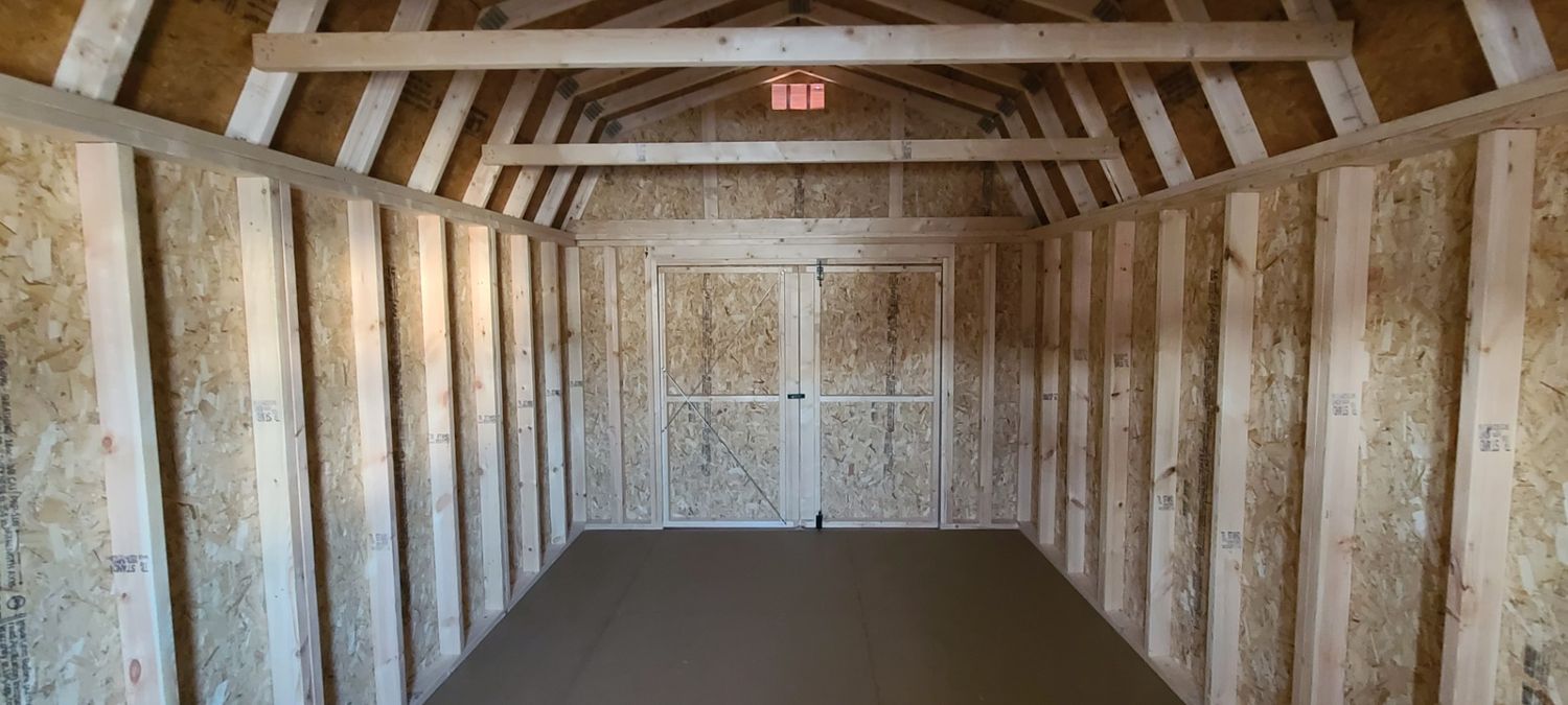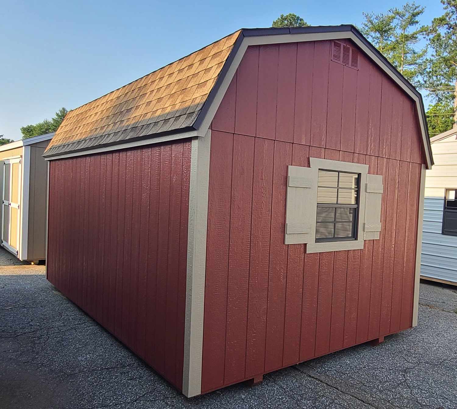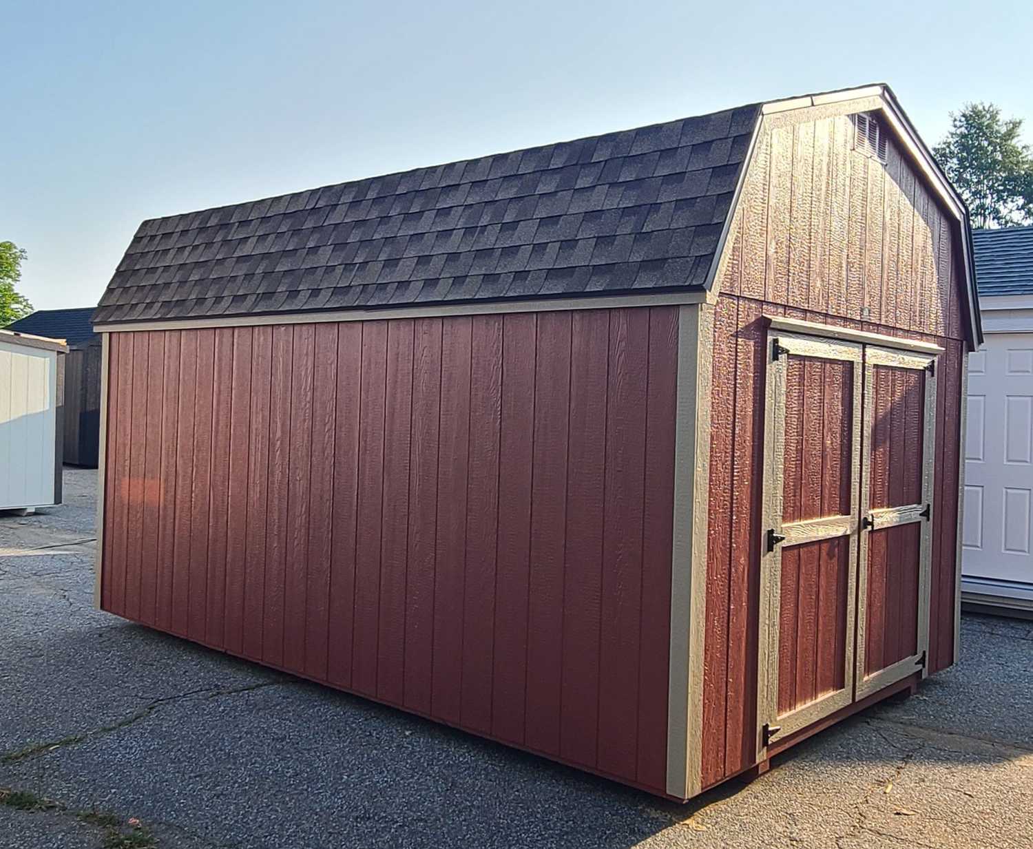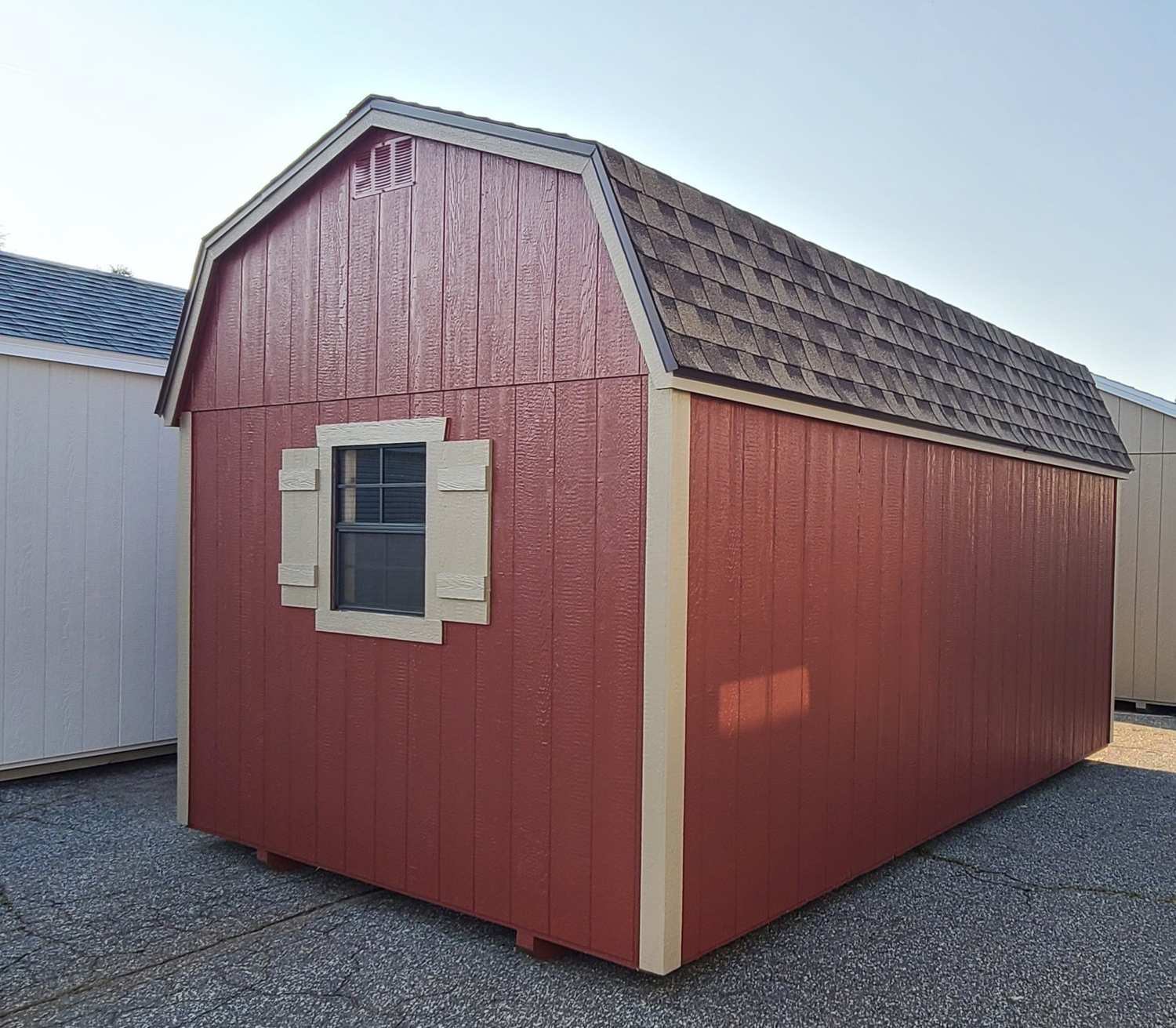 Condition: NEW Style: Dutch Barn Base Color: Red Barn Trim Color: Relaxed Khaki Roof Color: Colonial Slate Dimensions: 10′ W x 16′ L Add-ons: