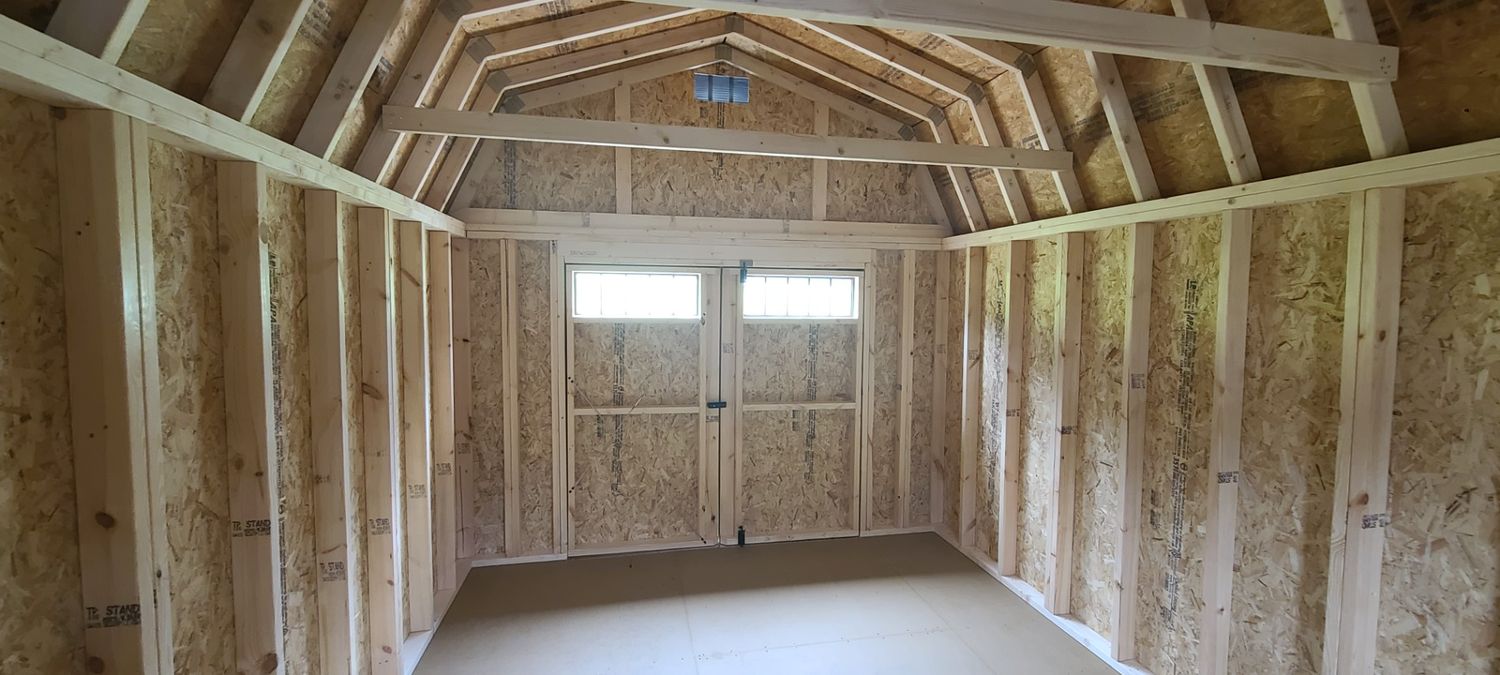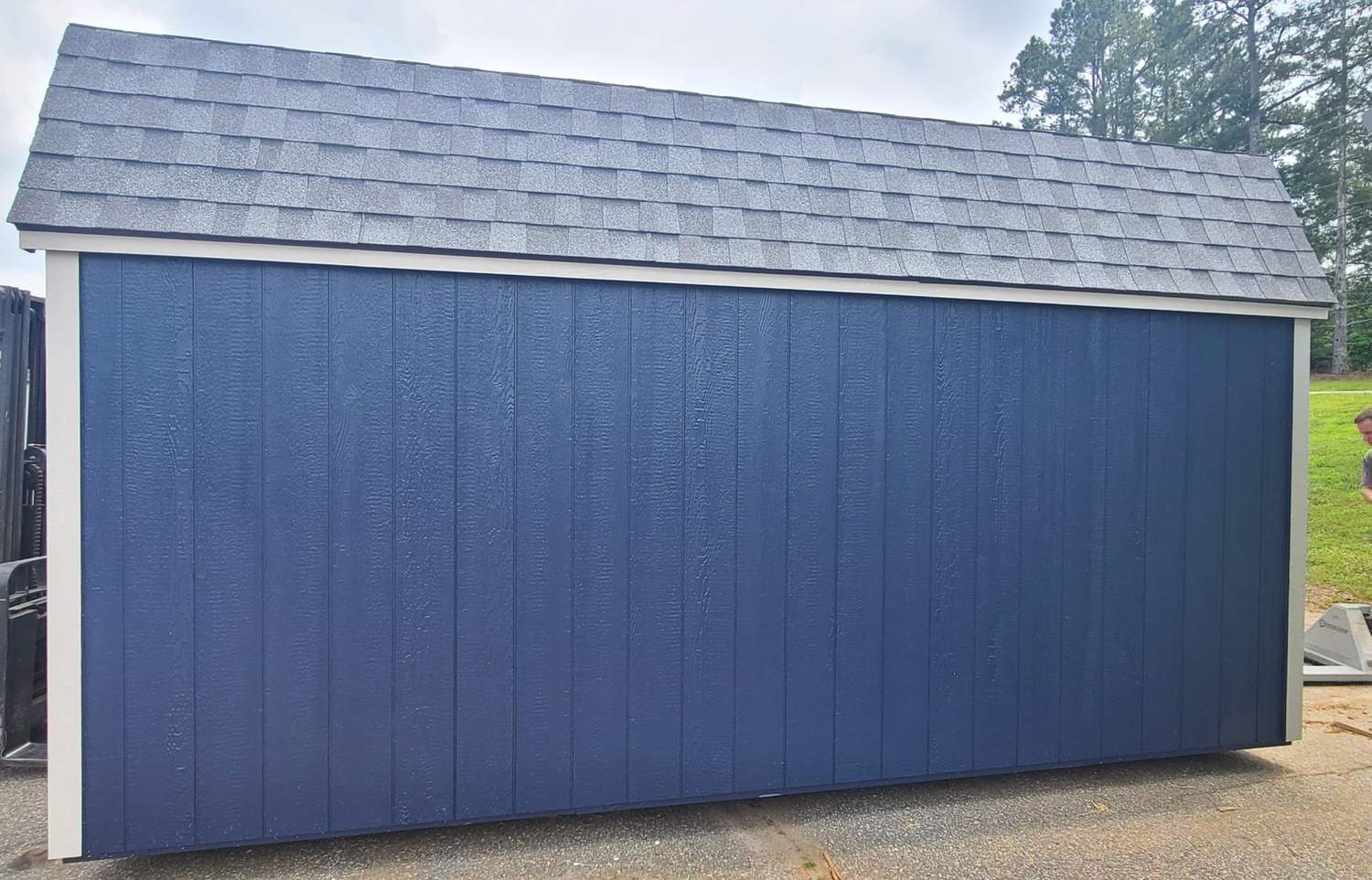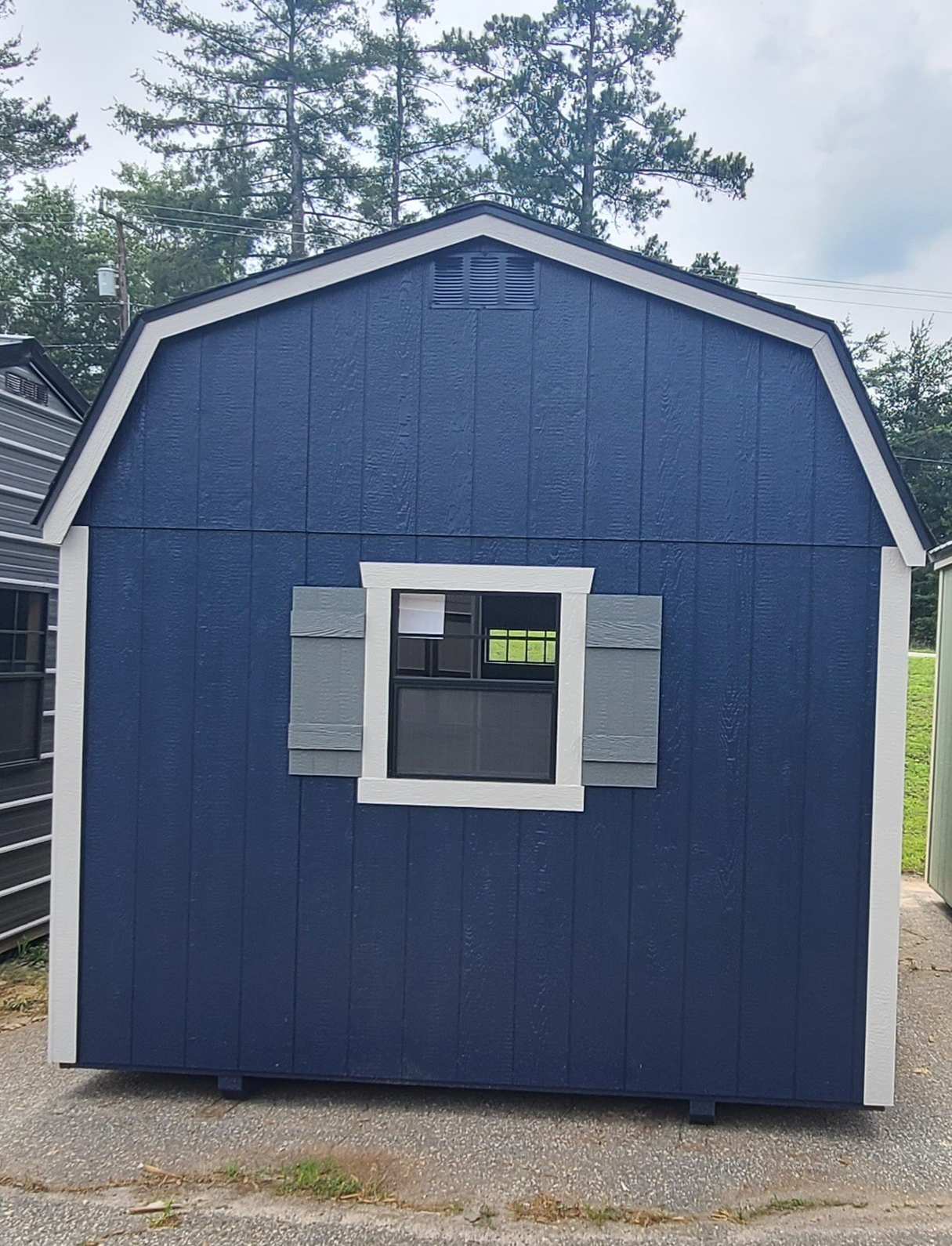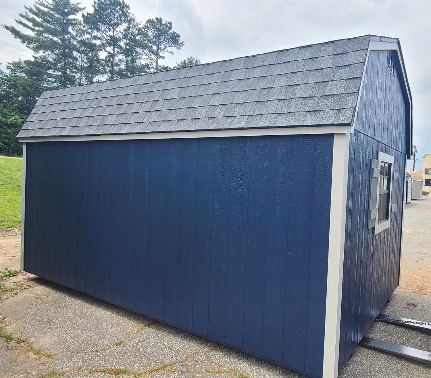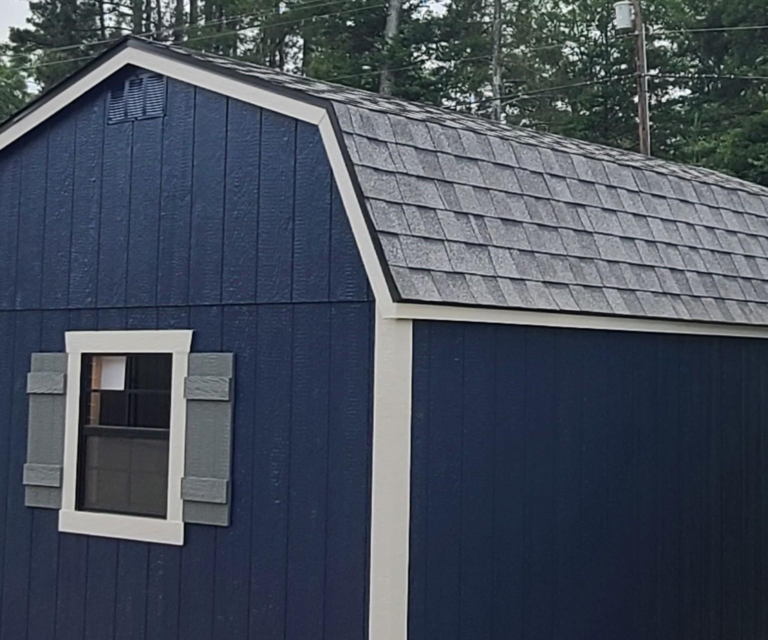 Condition: NEW Style: Dutch Barn Base Color: Naval Trim Color: Mindful Gray Roof Color: Pewter Gray Shingles Dimensions: 10′ W x 16′ L Add-ons:
