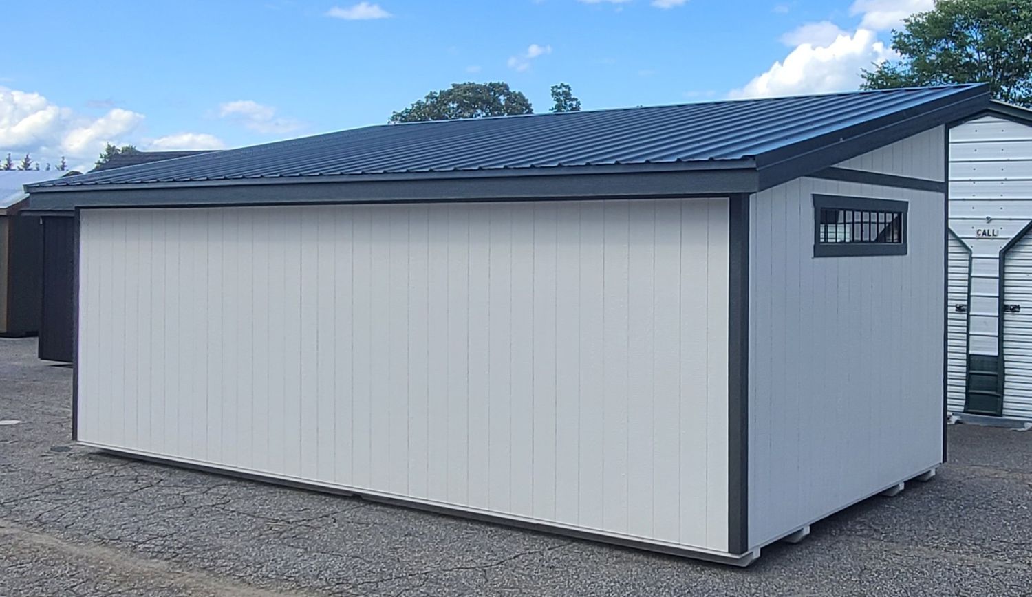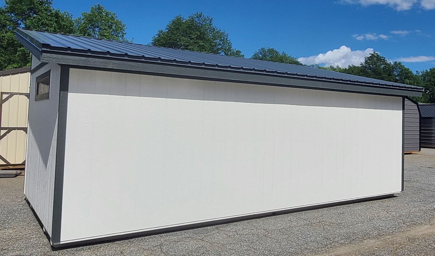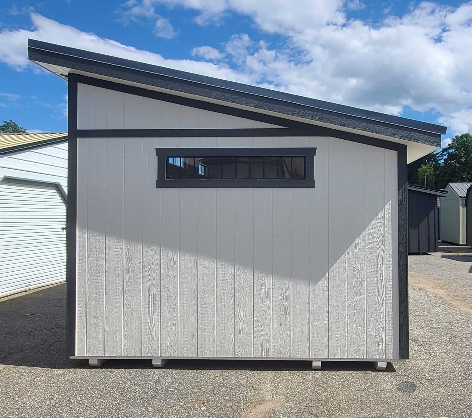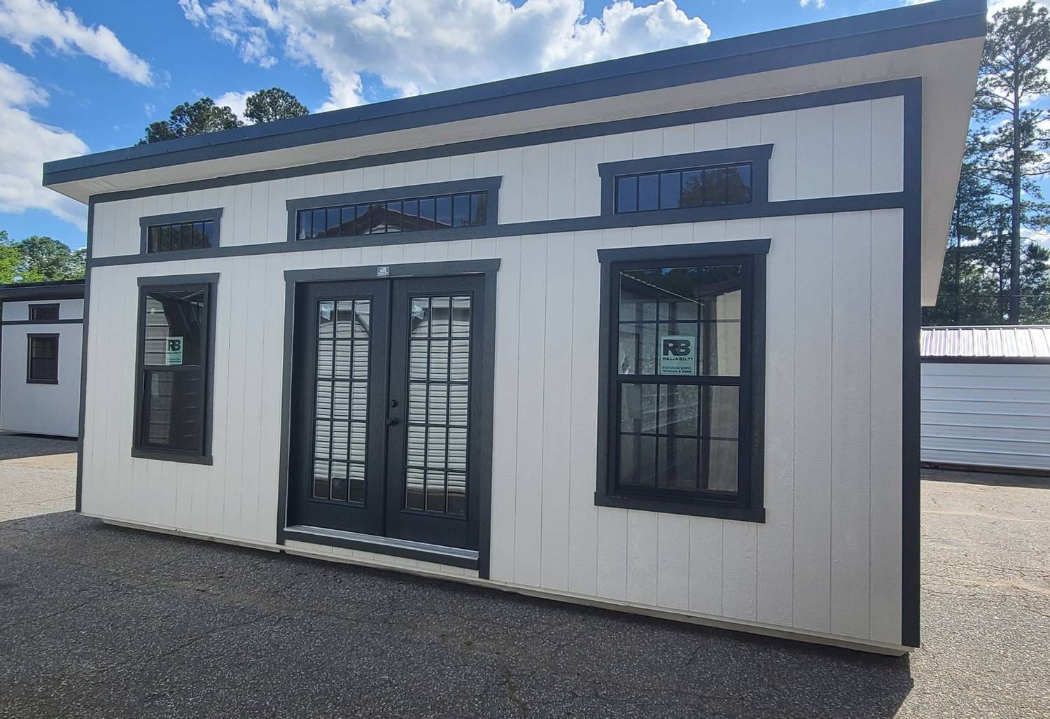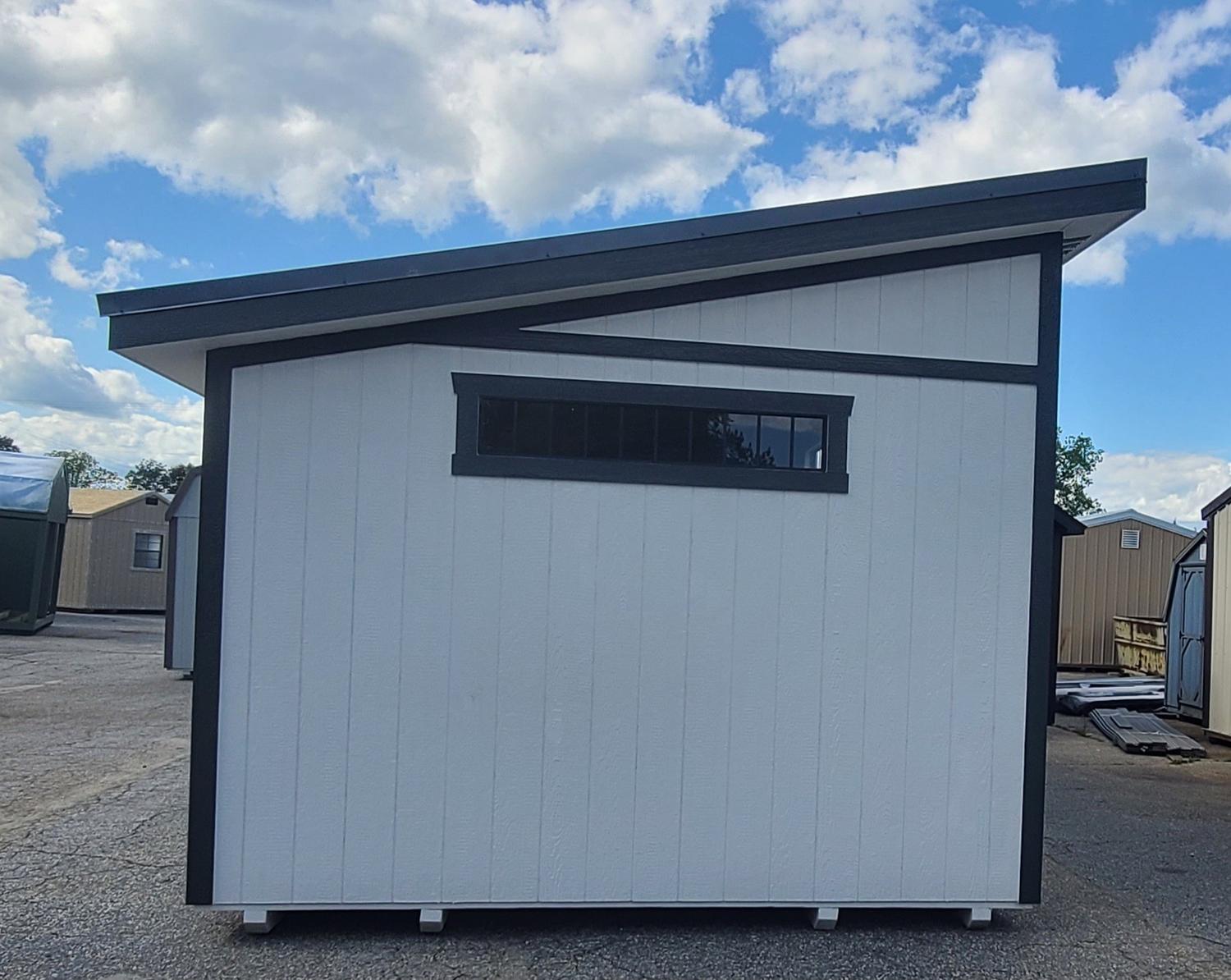 Condition: NEW Style: Studio Shed Base Color: Pearly White Trim Color: Rock Bottom Roof Color: Deep Gray Dimensions: 12′ W x 24′ L Add-ons:
