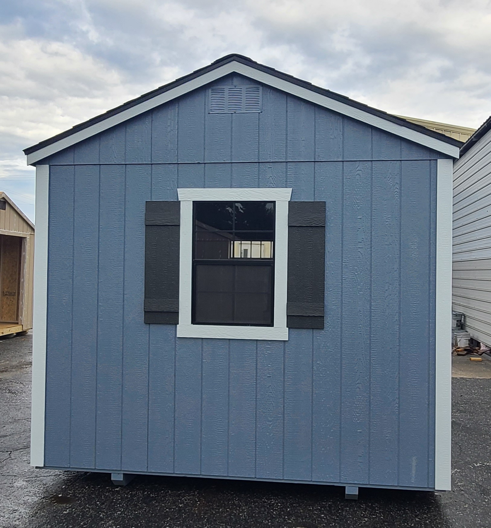 Condition: NEW Style: Cottage Base Color: Storm Cloud Trim Color: Topsail Roof Color: Pewter Gray Shingles Dimensions: 10’W x 12’L Add-ons: