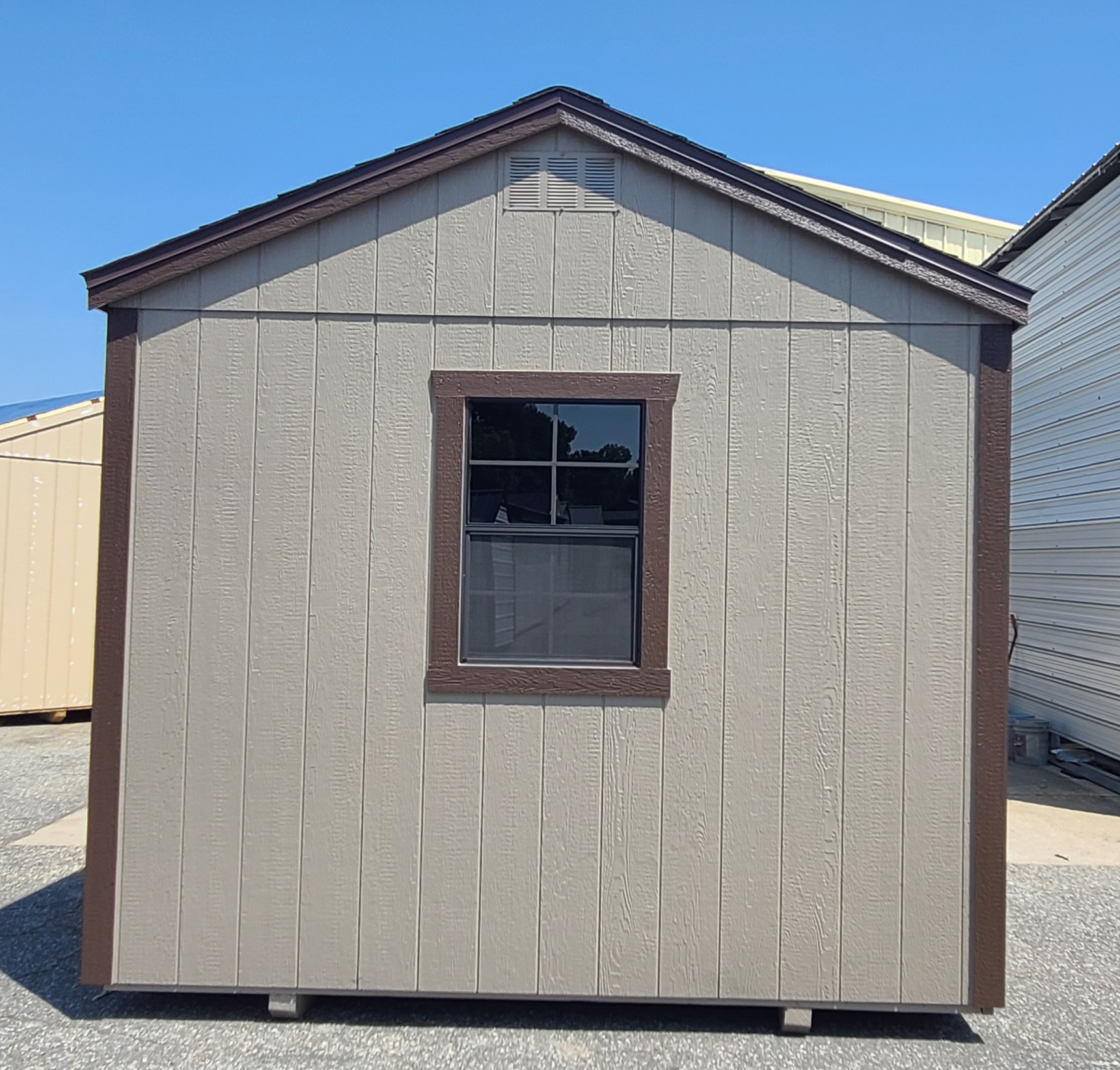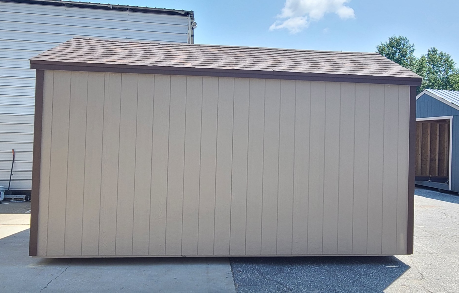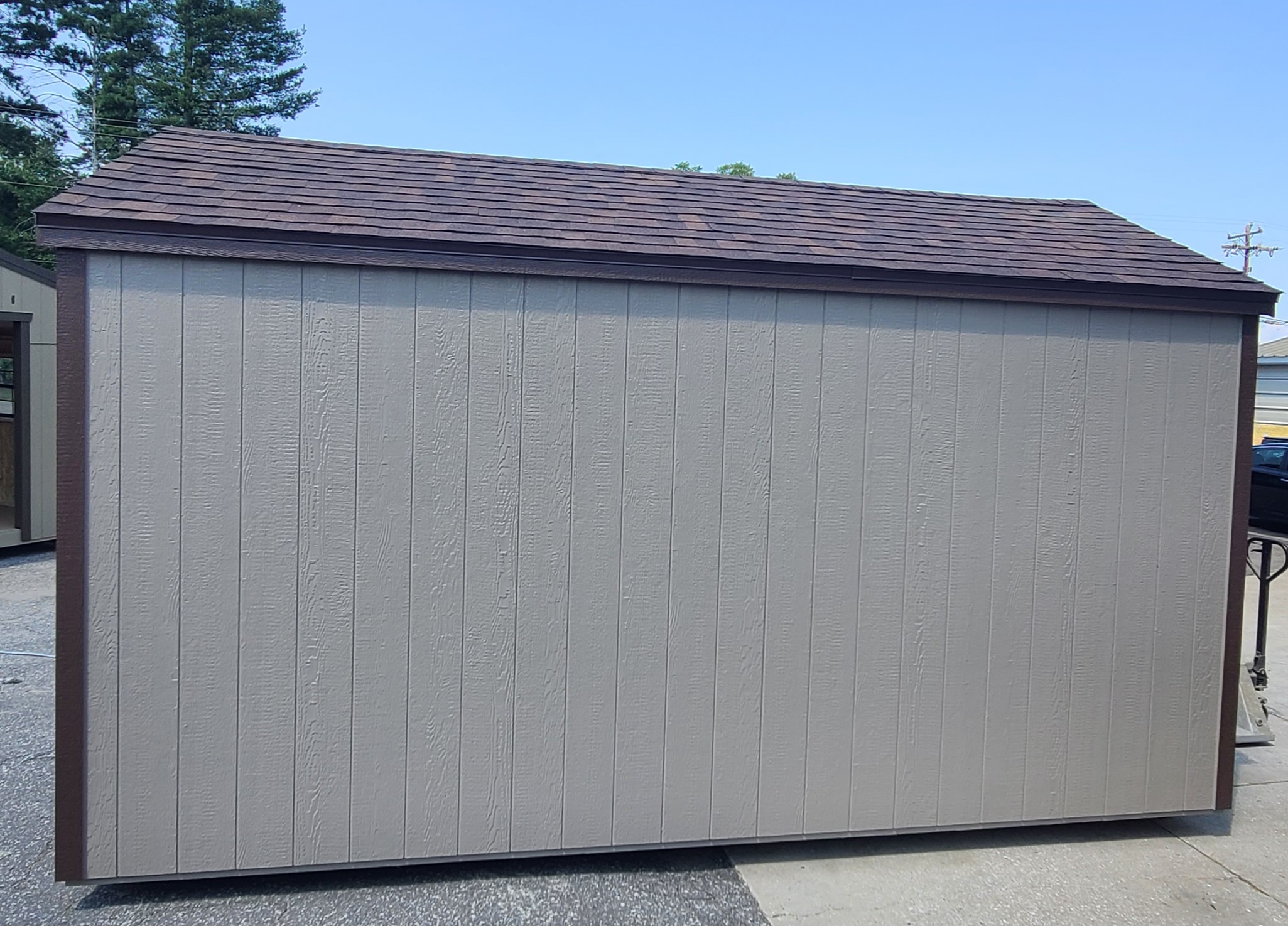 Condition: NEW Style: Cottage Base Color: Keystone Gray Trim Color: Otter Roof Color: Brownwood Shingles Dimensions: 10’W x 16’L Add-ons: